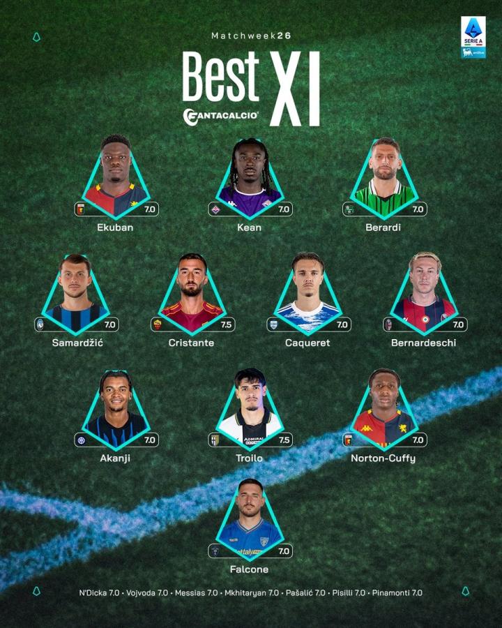 北京时间2月24日,意甲官方评选出了意甲第26轮的最佳11人阵容,莫伊塞-基恩、贝拉尔迪、克里斯坦特、贝尔纳代斯基和阿坎吉入选。