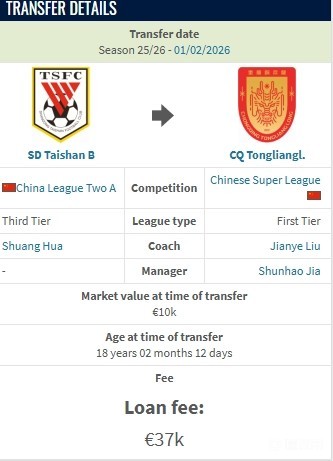 德转显示,重庆铜梁龙租借山东泰山后卫岳瑞杰的租借费约30万人民币。