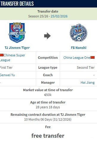 北京时间2月25日,德转更新,天津津门虎后卫钱宇淼自由转会佛山南狮。