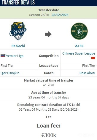 德转显示,浙江队新援瓜里拉帕的租借费为30万欧。