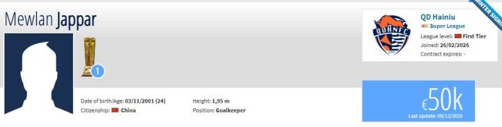 北京时间2月26日,德转更新,温州队门将买乌兰加盟青岛海牛,转会费约50万人民币。