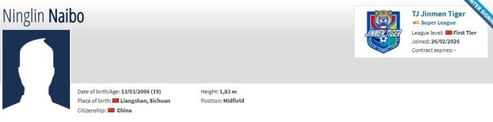 乃博宁林现年19岁,司职中场,此前效力于中冠四川顶耀中藤。