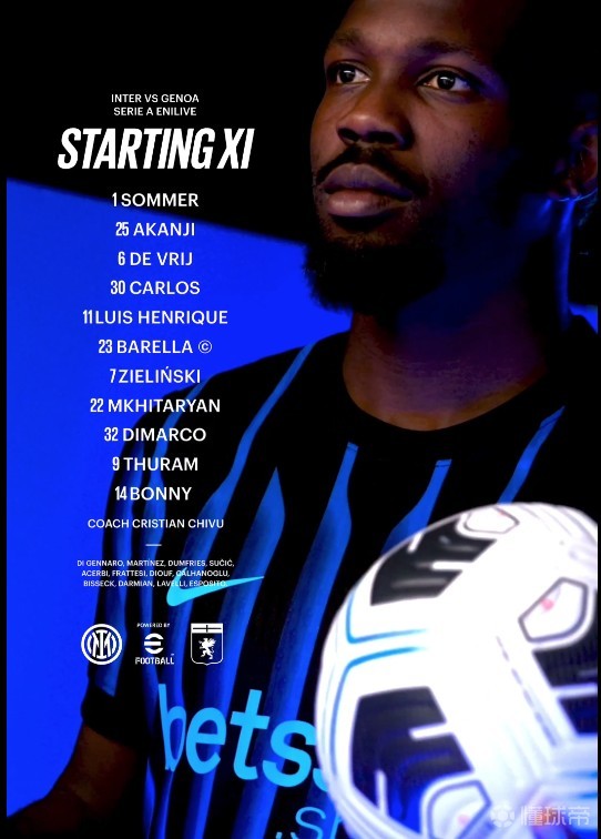 国米首发:1-索默、25-阿坎吉、6-德弗赖、30-卡洛斯-奥古斯托、11-路易斯-恩里克、23-巴雷拉、7-泽林斯基、22-姆希塔良、32-迪马尔科、9-图拉姆、14-博尼