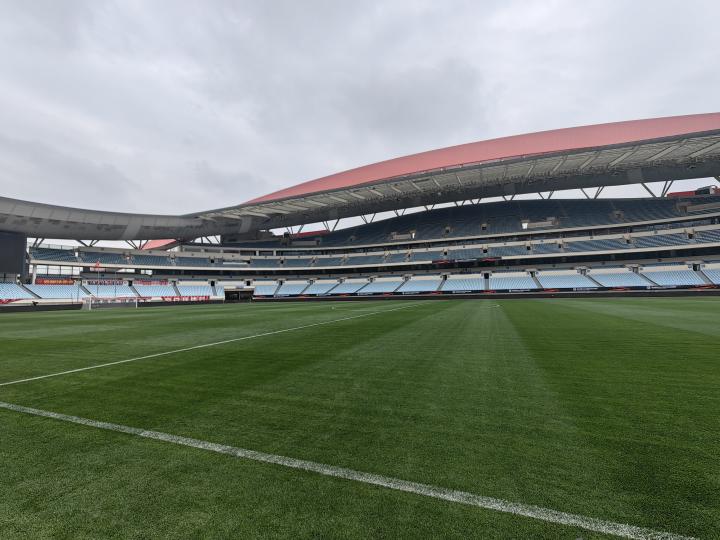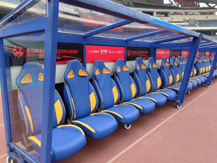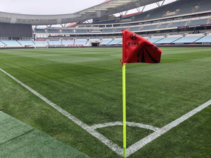 目前南京奥体中心内场已经布置好了超级杯的相关物料,场地草皮也较为平整。