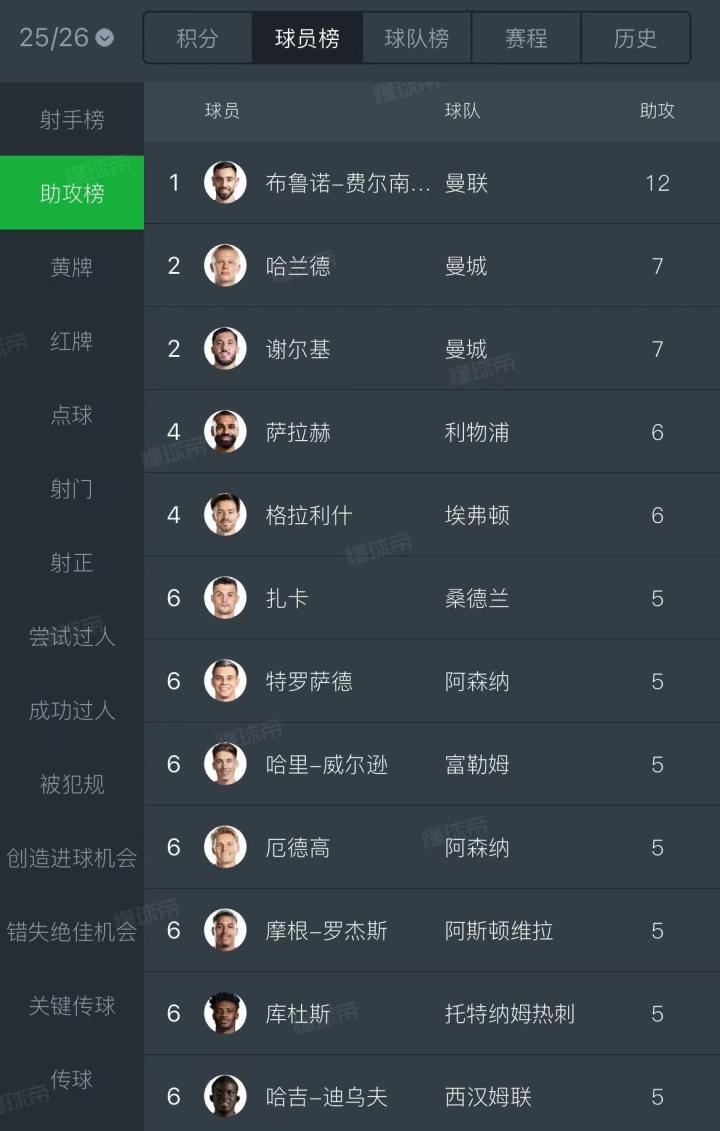 根据统计,本赛季到目前为止,布鲁诺-费尔南德斯已经在英超当中送出了13个助攻,在英超助攻榜上遥遥领先,排在第二的是哈兰德和谢尔基,都送出了7次助攻。