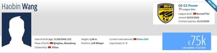 北京时间3月2日,德转更新,山东泰山19岁前锋王昊斌租借加盟广东广州豹。