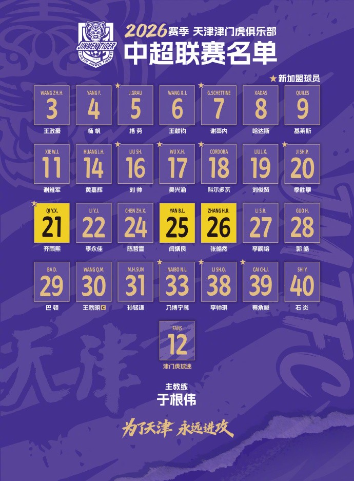 北京时间3月3日,天津津门虎公布2026赛季大名单,共28名球员,谢蒂内7号,格劳5号,科尔多瓦18号,萨尔瓦多未报名。
