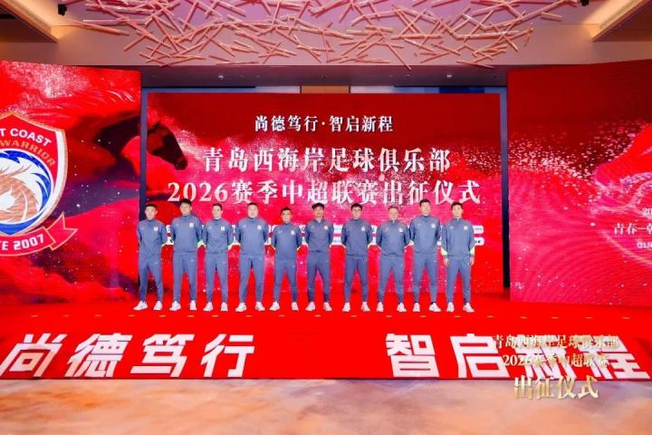 尚德笃行,智启新程。3月4日,青岛西海岸足球俱乐部2026赛季中超联赛出征仪式在青岛石灿酒店希尔顿格芮精选酒店“凯旋厅”成功举行。青岛市人大常委会副主任、市总工会主席张建刚,青岛市副市长赵胜村,市政府办公厅副主任慕建光,青岛市体育局党组书记、局长蔡全记,青岛广播电视台党委书记、台长、青岛广电影视传媒集团有限公司董事长谭鹏,青岛市足球协会主席杨鹏鸣,青岛市足球协会常务副主席、秘书长、市足球运动管理中心主任田卫国,区人大常委会副主任曲波,区政府党组成员、副区长赵英民,区政府党组成员、副区长傅强,青岛自贸片区管委副主任秦禾,区教育和体育局党组书记、局长宗武邦,区教育和体育局党组成员、教育和体育事业发展中心主任王新峰,区总工会党组书记、常务副主席封伟,青岛西海岸足球俱乐部董事长徐尚,中国足坛名宿、俱乐部总顾问赵书田,副董事长蓝立宁,总经理申军,俱乐部党支部书记王天庆,主教练郑智,副总经理葛振,以及青岛西海岸新区海洋控股集团副总裁、青岛西海岸体育产业发展集团执行董事王皓,青岛开发区投资建设集团有限公司副总经理刘鹏,青岛西海岸体育产业发展集团总经理潘鹏,青岛西海岸旅投集团副总经理徐潇玲,青岛黄发集团商业公司总经理孙超群,青岛金天信科企业服务有限公司董事长金鹏,青岛国瑞体育文化产业有限公司董事长宫瑞华、海信广场赵路通、理想汽车唐菲、冯师傅茶业冯玉冰、班嘉隆葡萄酒洪勋、陈医生运动康复陈斌、领动运动康复赵震等赞助商领导嘉宾莅临现场。和俱乐部一线队全体教练员、队员和工作人员以及媒体和球迷共三百余人共同见证俱乐部向新赛季挥旗出征。