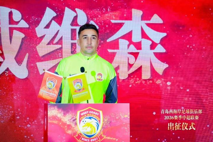 在2026赛季中超出征仪式上,青岛西海岸队队长戴维森代表全队,向一直支持球队的各界人士与广大球迷致以诚挚谢意。新赛季,全队将团结一致、迎难而上,在赛场上全力以赴、拼搏到最后一刻,以最佳状态回报球迷与社会各界的支持。在场下,我们团结一心、谦逊专注,用行动守护球队的荣誉,代表青岛这座城市的体育精神。并代表全体队员承诺认真训练、公平竞技、每一场都拼尽全力,用汗水与成绩回报大家的期待。