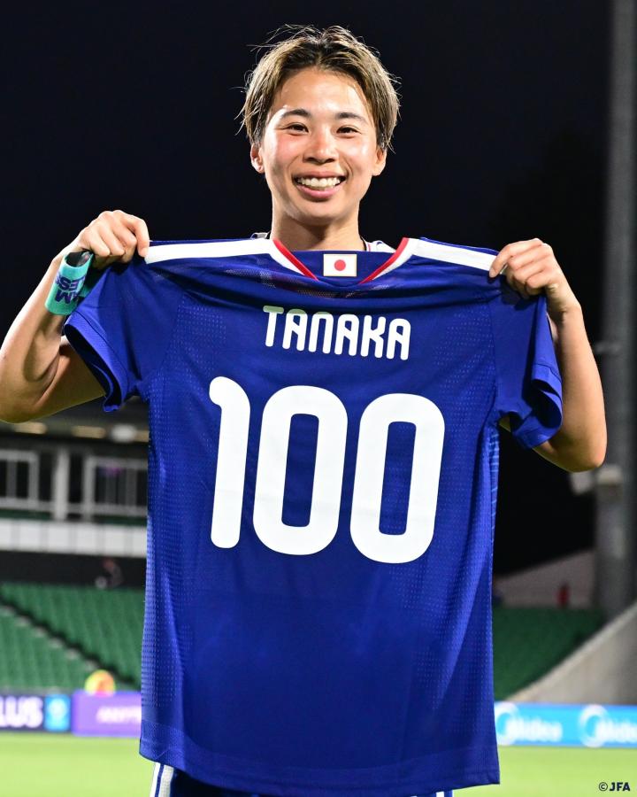本场比赛下半场,日本女足国脚田中美南替补出场,据日本足协统计,这场比赛是她代表日本女足国家队出场的第100场比赛,在100场比赛中,田中美南贡献46粒进球。