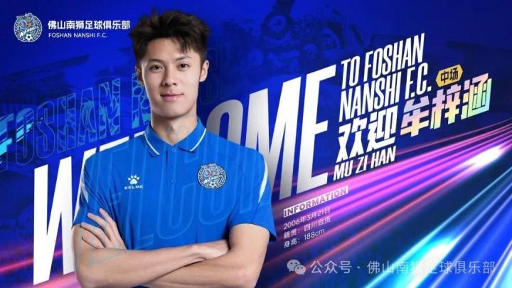 经与青岛西海岸足球俱乐部及球员本人友好协商并达成一致,即日起,牟梓涵租借加盟佛山南狮足球俱乐部,新赛季他将身披南狮战袍,给球队注入无限活力,开启“青春风暴,狮力全开”的新征程,为城市而战!