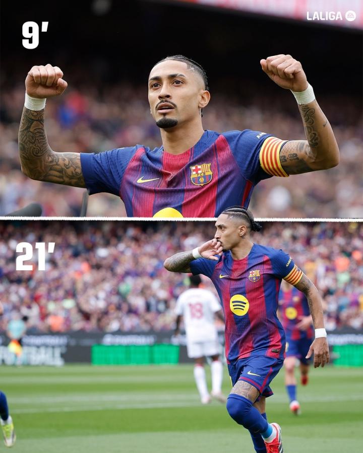 西甲第28轮,巴塞罗那主场对阵塞维利亚,上半场拉菲尼亚通过点球机会打入两球,成为本世纪第六位西甲单场打入两粒点球的巴萨球员。