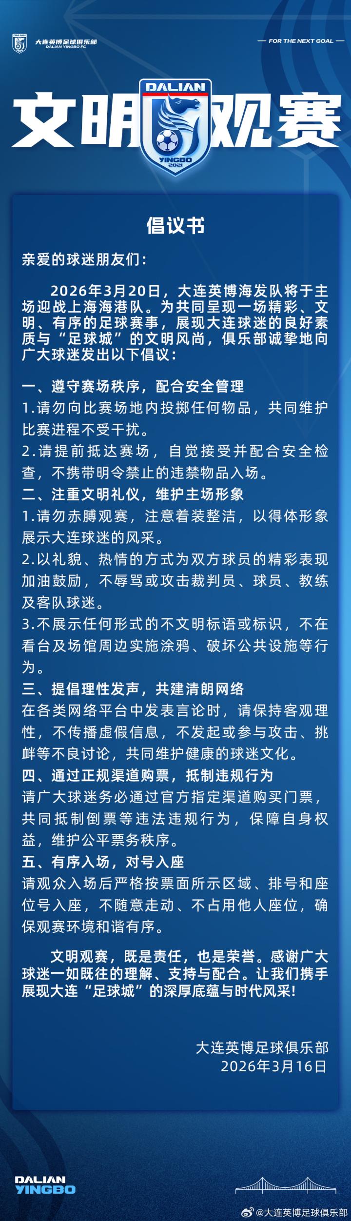 大连英博将在3月20日迎来赛季主场首战,对手是上海海港。今日大连英博发布文明观赛倡议书。