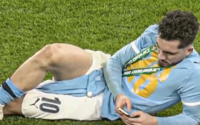 在今天凌晨进行的英联杯决赛中,曼城2-0击败阿森纳夺冠,赛后的照片可以看到,在颁奖典礼结束后,谢尔基在球场内躺着玩手机。