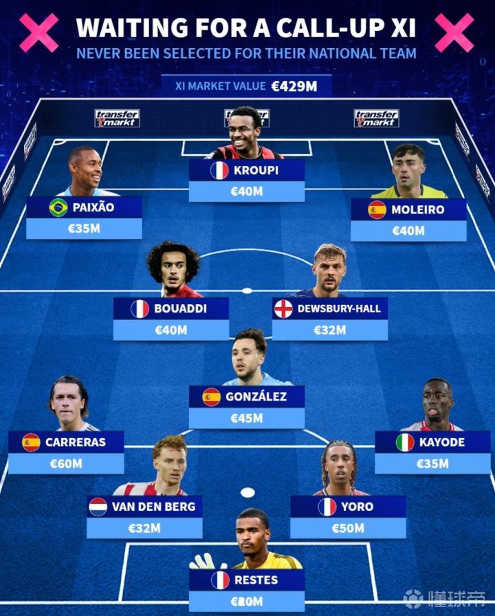 北京时间3月26日,德转列出了从未被成年国家队征召的最贵11人阵容,阿尔瓦罗-卡雷拉斯、约罗以及尼科-冈萨雷斯领衔。