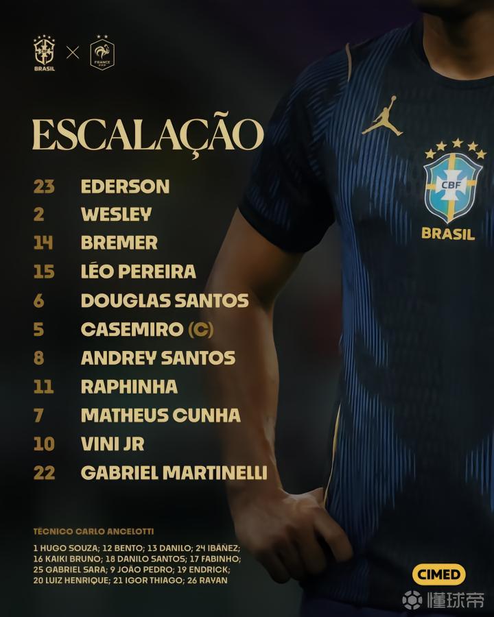 巴西首发:23-埃德森、2-韦斯利-利马、14-布雷默、15-莱奥-佩雷拉、6-道格拉斯-桑托斯、5-卡塞米罗、8-安德雷-桑托斯、10-维尼修斯、7-马特乌斯-库尼亚、11-拉菲尼亚、22-马丁内利