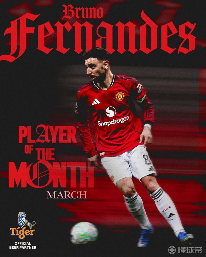 曼联官方宣布,B费当选俱乐部3月最佳球员,击败了状态同样出色的卡塞米罗、库尼亚。