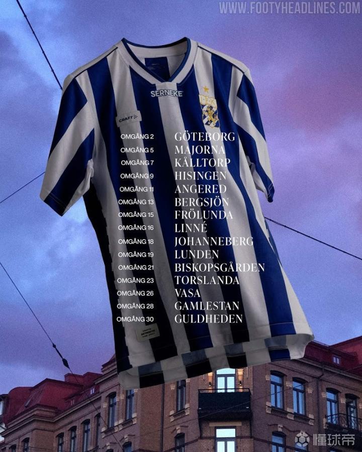 新赛季主场球衣延续了俱乐部标志性的蓝白竖条设计,但细节更具创意:蓝色条纹中巧妙地融入了哥德堡市的街区格局和城市地图,使球衣不仅彰显俱乐部传统,也展现城市特色。据悉,本赛季哥德堡队将为每场主场比赛准备不同版本的球衣,共计15款,每款都代表城市的一个独特区域。