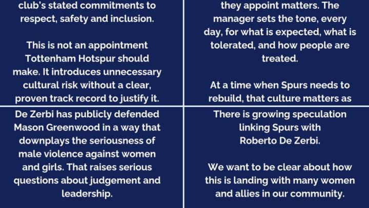此前被归咎于罗伯托-德泽尔比的言论——包括在梅森-格林伍德面临严重指控后,公开发表为其辩护、美化其行为的评论——已遭到广泛批评,这些言论看似在淡化针对女性的暴力行为的严重性。无论其初衷如何,这种表述方式都存在风险:它会让有害的态度正常化,淡化幸存者的经历,并向整个足坛传递一个令人深感担忧的信号——即这类行为是可以被容忍的。