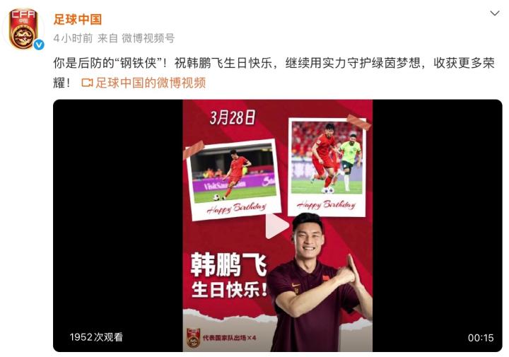 官方在今天上午发文表示:你是后防的“钢铁侠”!祝韩鹏飞生日快乐,继续用实力守护绿茵梦想,收获更多荣耀!