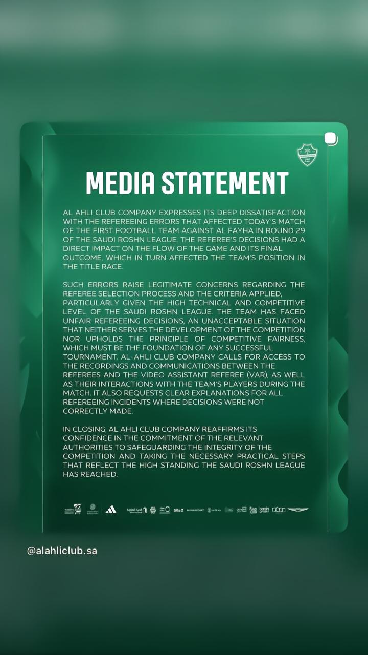 最后,吉达国民俱乐部重申,我方目前依然相信相关联赛主管机构会致力于维护赛事的公正性,并采取必要的实际措施,以匹配沙特联赛目前所达到的高水平与声誉。