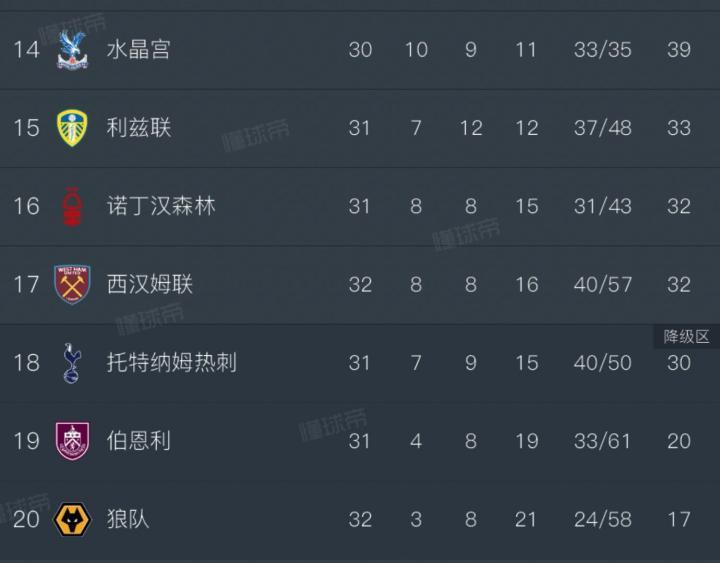 英超第32轮,西汉姆联主场4-0击败狼队,排名升至第17,同时将热刺拽进了英超降级区!