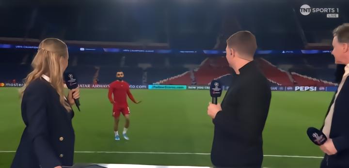 萨拉赫在做什么?他只顾着在镜头前给自己加戏,跑去和史蒂文-杰拉德、史蒂夫-麦克马纳曼握手。