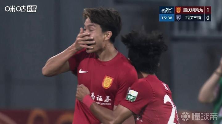 北京时间4月11日,中超第5轮,重庆铜梁龙暂以2-0的比分领先武汉三镇。为重庆铜梁龙首开记录的陈纯新进球后捂嘴庆祝。