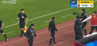 第35分钟,铁人教练团队成员抗议判罚,裁判出示黄牌