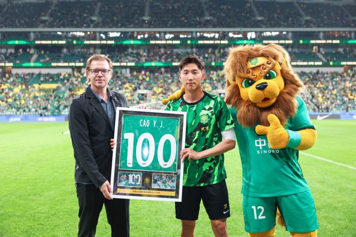 北京时间4月25日,中超第8轮,北京国安主场迎战天津津门虎。赛前,北京国安体育总监马永明为曹永竞颁发国安百场纪念球衣。