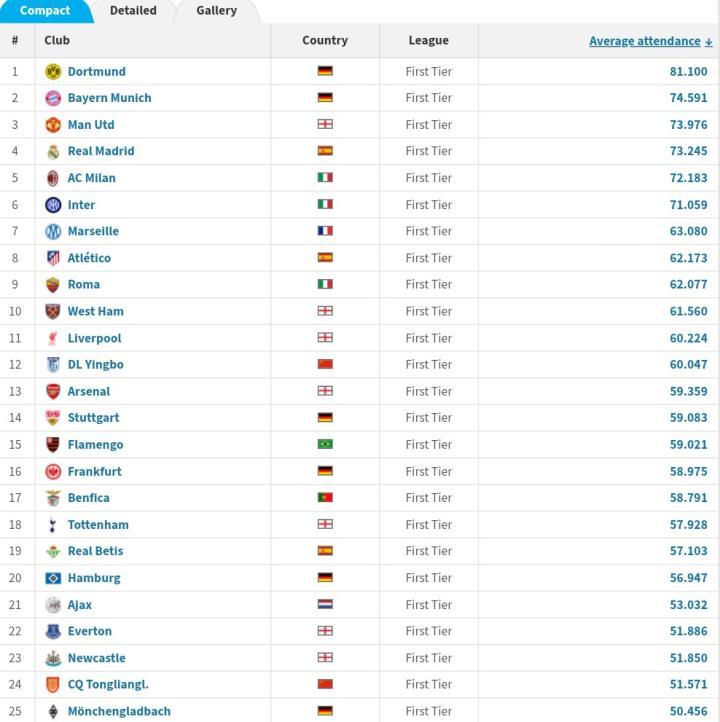 北京时间4月27日,据德转数据统计,大连英博主场平均上座人数为60047人,位列全球第12位,超越阿森纳主场平均上座人数的59359人。此外,重庆铜梁龙主场平均上座人数为51571人,位列全球第24位。