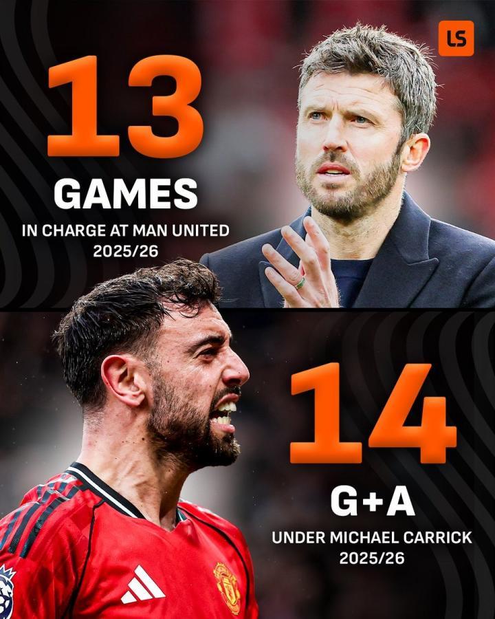 自卡里克在今年1月中旬上任以来,布鲁诺-费尔南德斯在曼联的13场比赛中直接参与了14球,场均超过1球。