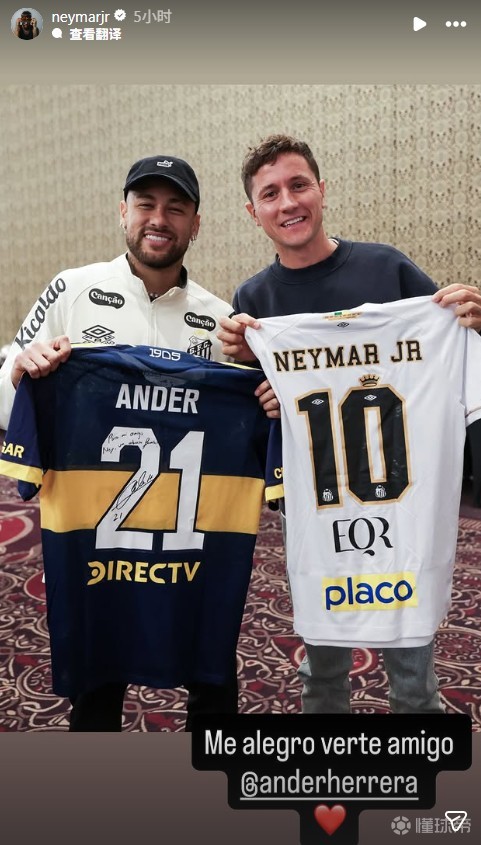 内马尔晒出了自己与埃雷拉交换球衣的照片,并配文:“很高兴见到你,朋友”,两人曾在巴黎圣日耳曼共事。